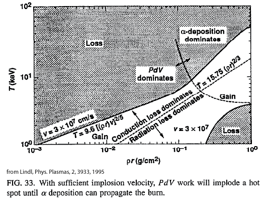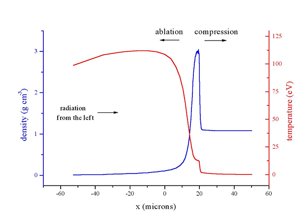 Inertial Confinement Fusion, in its most general definition, is the process of compressing and heating hydrogen isotopes to the extent that the nuclei can overcome the coulomb barrier (i.e. the electrostatic repulsion of like-charges) and fuse together (into helium) releasing huge amounts of energy. It is distinct from magnetic fusion, in which a low density plasma is heated and then confined using magnetic fields as the fusion reactions progress. In inertial confinement fusion (ICF), the compression and heating of the fuel is accomplished by depositing massive amounts of energy on the outside of a solid, spherical fuel capsule. As this energy is deposited in a thin layer on the outside of the capsule, that layer heats up and the over-pressure in this narrow region leads to both the ablation of material outward and the launching of a shock wave inward. If the characteristics of the ablation and the shock wave(s) are controlled precisely, then a small region in the interior of the fuel capsule can enter the region of temperature-column density parameter space in which fusion reactions efficiently occur. The fusion energy from such an initial "hot spot" is then deposited in the rest of the capsule, generating further reactions. This process is termed "ignition" and has not yet been achieved, but should be in the National Ignition Facility (NIF), currently being built at Livermore National Lab. It is the inward directed momentum of the implosion - the inertia of the core of the fuel capsule - that keeps the fuel confined for the roughly 1 ns required for the fusion reactions to proceed. In "indirect-drive" ICF the energy source that drives the ablation and compression is radiation (X-rays) that is produced by the conversion of a non-thermal, directed energy source (lasers or particle beams) into thermal radiation inside a high-opacity enclosure, referred to as a "hohlraum." |