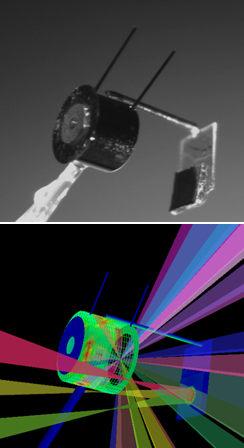 The upper image on the left is a photograph of one of our halfraum targets from our OMEGA campaign. The stalk that holds the halfraum can be seen in the lower left corner of the image. The ablator sample is secured on the left end of the halfraum under a gold washer. The wires on the barrel of the halfraum are used for positioning within the target chamber. A backlighter foil is hung off of the open end of the halfraum, and is visible in the lower right corner of the image. The foil is mounted on the lead-doped plastic (to facilitate viewing the halfraum while positioning it). The lower panel shows our view factor modeling of the halfraum as it's irradiated by 15 beams, with three additional beams on the backlighter foil. The color coding shows emission temperatures of each surface element. The output of this simulation is used as input to a hydrodynamics simulation. These simulations are post-processed in order to produce model absorption spectra, which we ultimately compare to data.