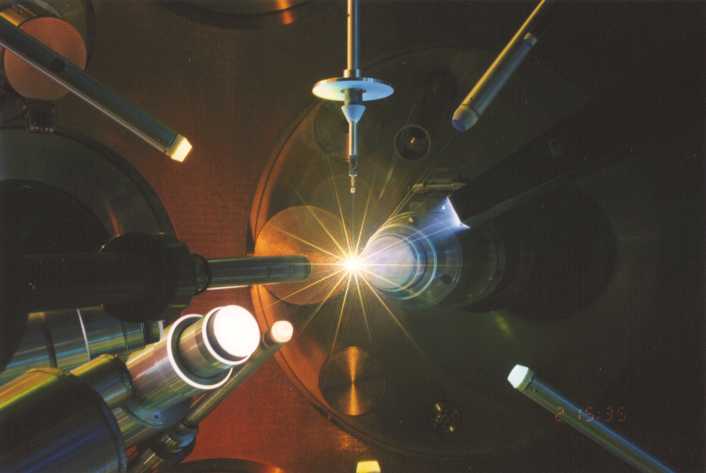 This is the interior of the OMEGA target chamber at the Laboratory for Laser Energetics at the University of Rochester during a laser shot.