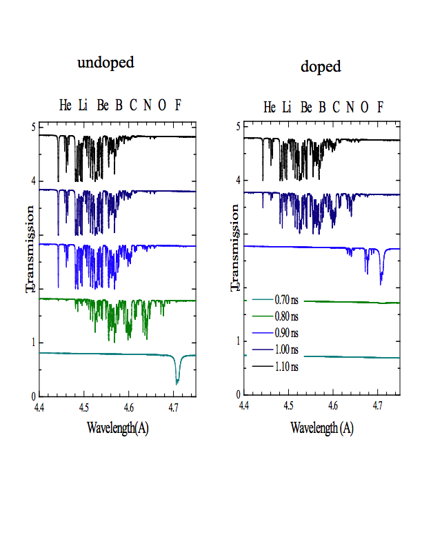 Our understanding of, and ability to control, the nature of the coupling of the hohlraum radiation field to the outer layer of the fuel capsule (the "ablator") is a crucial factor in producing an efficient implosion and, ultimately, achieving ignition. To this end, we have developed X-ray spectroscopic techniques for diagnosing the time-dependent ionization state in a thin tracer layer deposited on the interior of a sample of ablator material exposed to a hohlraum radiation field. Our April 2000 campaign included several shots for which we were able to measure a delay in the turn-on time of the K-alpha absorption signals between germanium doped plastic ablator samples and undoped samples. An overview of the project and context is given in this presentation (pdf). The results have been published in "Tracer spectroscopy diagnostics of doped ablators in inertial confinement fusion experiments on OMEGA" by Cohen, MacFarlane, Jaanimagi, Landen, Haynes, Conners, Penrose, & Shupe, Physics of Plasmas, 11, 2702 (2004). |