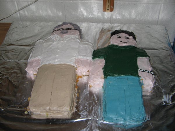 ...in the ever-popular artistic medium of the cake portrait. Larger versions [1 and 2]. (Credit to Blair Reaser and Jennifer Yee.) And while we're at it, how about my mother-in-law's name in lights?