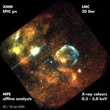 | Of course the vast majority of Chandra press involves images rather than spectra. This is an image of the Cas A supernova remnant made with the ACIS detector on Chandra. There is some low resolution spectral information in this image (the chips in the ACIS detector have some inherent spectral discrimination), which is color coded according to wavelength. Each color/wavelength represents (roughly) a different chemical element. The surprising result of this observation is that the supernova turns itself inside-out when it explodes, with the oxygen-rich outer layers of the progenitor star ending up on the inside of the remnant while the iron-rich core gets mixed into the outer regions of the remnant. Read more about the results here. | ![]() |