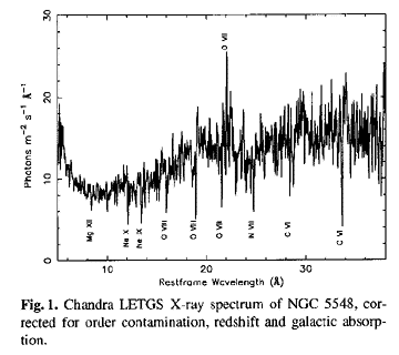 | Sources like Seyfert galaxies show absorption lines from an obscuring medium which is both "backlit" by the hard, central X-ray source and photoionized by it. Here's an unprecedented X-ray absorption spectrum of a Seyfert galaxy taken with the Chandra LETG Spectrometer. |